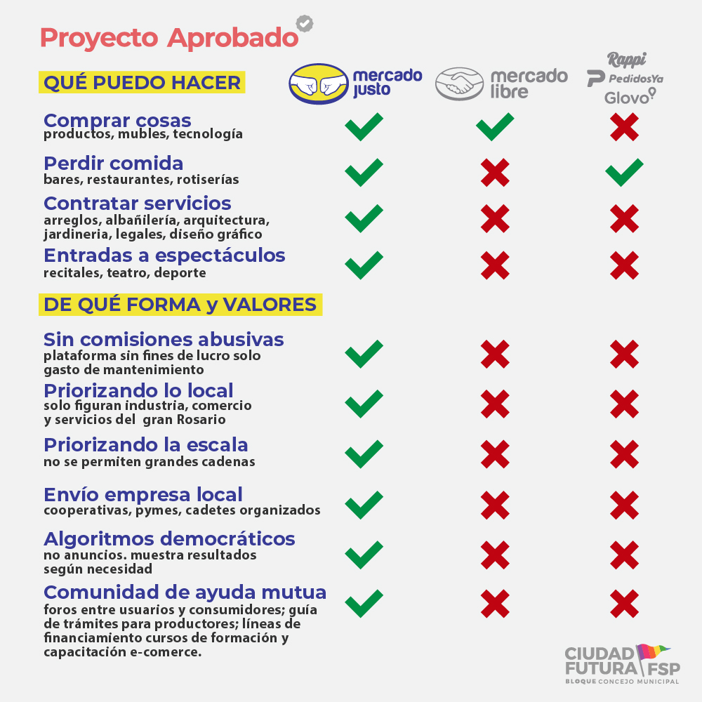 El Proyecto de Ordenanza presentado por el bloque de Ciudad Futura (Expte. 231434 de 2016) que consistía en crear una Plataforma Web de Economía Social bajo el dominio vidrieraeconomiasocial.rosario.gov.ar, en vistas a que el portal de Economía Social de la Municipalidad de Rosario difundía las políticas públicas desplegadas hacia el sector y los canales de comercialización de los productos, pero que, sin embargo, éste no contaba con un Catálogo de los mismos, ni permitía el vínculo e intercambio entre los distintos actores involucrados. El proyecto de Ordenanza presentado por el Bloque Ciudad Futura (Expediente 231.221 de 2016), el cual propone la creación en la ciudad de Rosario el Servicio “Compro en Mi Barrio”, el cual consiste en generar los medios para elaborar, poner en marcha y administrar una Aplicación (app) para unidades móviles, orientada a promocionar el intercambio y el comercio de cercanía, brindar información al consumidor/a y potenciar a los pequeños comercios y prestadores de servicios