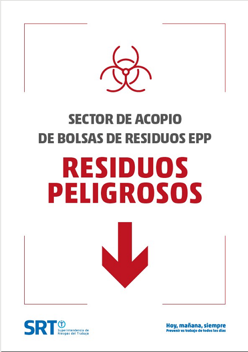 - Realizar la disposición y la gestión de residuos de EPP y de ropa de trabajo descartables del conjunto de trabajadores en forma diaria. Se recomienda adoptar de referencia las instrucciones del Ministerio de Salud de la Nación: “COVID-19 RECOMENDACIONES PARA LA GESTIÓN DE RESIDUOS DOMICILIARIOS DE PACIENTES EN CUARENTENA” (https://www.argentina.gob.ar/salud/coronavirus- COVID-19).Estos es doble bolsa color rojo, identificación del contenido (EPP y desechos de elementos de higiene y desinfección).