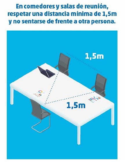 - En comedores y salas de reunión, respetar una distancia prudencial mínima de entre 1,5 y 2 metros según corresponda