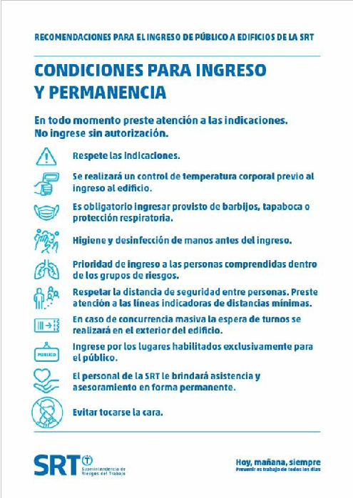- Conformación de equipos de auxiliares para asistir a las personas que aguardan su turno en el exterior del edificio, como así también para colaborar en la higiene y desinfección de personas. Tendrán como función asesorar a dicho público respecto a las condiciones de ingreso y de las medidas de seguridad implementadas (barbijo o tapaboca, distancias de seguridad, higiene y desinfección de manos y elementos personales). Estos equipos deberán estar conformados por el propio personal de la SRT, eximiendo de esta tarea al personal de seguridad, el podrá brindar asistencia ante situaciones específicas.