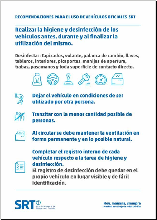 Se deberán adoptar las recomendaciones formuladas en el Protocolo SRT, debiendo en forma adicional atender las sugerencias que se exponen seguidamente: