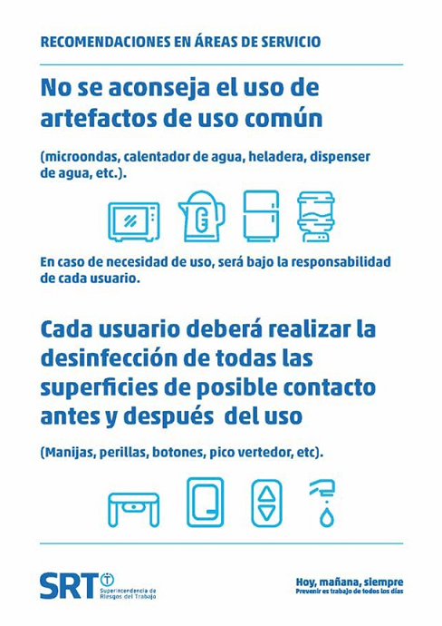 - Desaconsejar la utilización de artefactos de uso común (microondas, calentador de agua, heladera, dispenser de agua, etc.). En caso de considerarlo necesario, será bajo la responsabilidad de cada usuario trabajador o trabajadora debiendo asimismo realizar la desinfección de todas las superficies de posible contacto antes y después del uso (manijas, perillas, botones, pico vertedor, etc.). Se colocará kit de desinfección en las áreas donde se encuentren los artefactos de uso común.