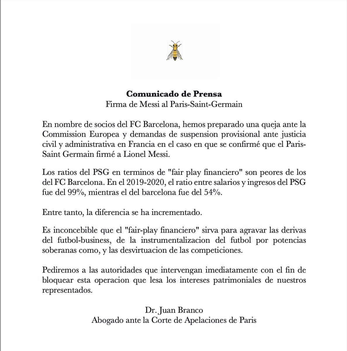 En nombre de socios del FC Barcelona, mi bufete ha preparado una queja ante la Commission Europea y demandas de suspensión provisional ante justicia civil y administrativa en Francia para impedir que el Paris-Saint Germain firme a Lionel Messi, tuiteó Juan Branco, un abogado.