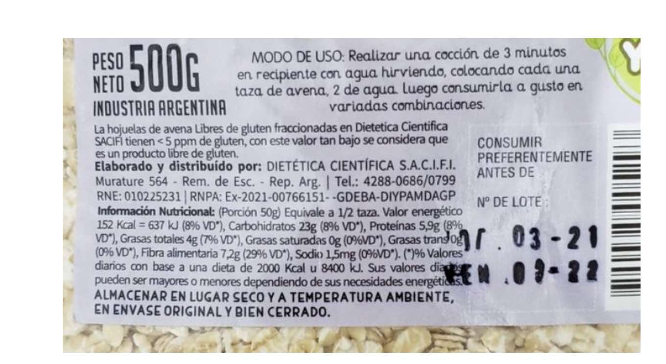 Avena Arrollada Fina, Libre de Gluten, RNPA: EX – 2021- 00766151-GDEBA-DIYPAMDAGP y Avena Arrollada, Libre de Gluten, RNPA: EX – 2021 -00242429-GDEBA-DIYPAMDAGP por lo que recomienda a la población celíaca se abstenga de consumirlos y a quienes lo expendan que los retiren de la comercialización y contacten al proveedor.
