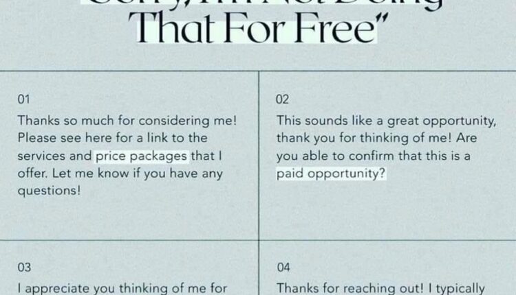 “Valoro que pienses en mí para esta oportunidad. Desgraciadamente estoy impedido de aceptar cualquier proyecto que no sea pago en este momento, pero te escribiré de nuevo si eso cambia.”
