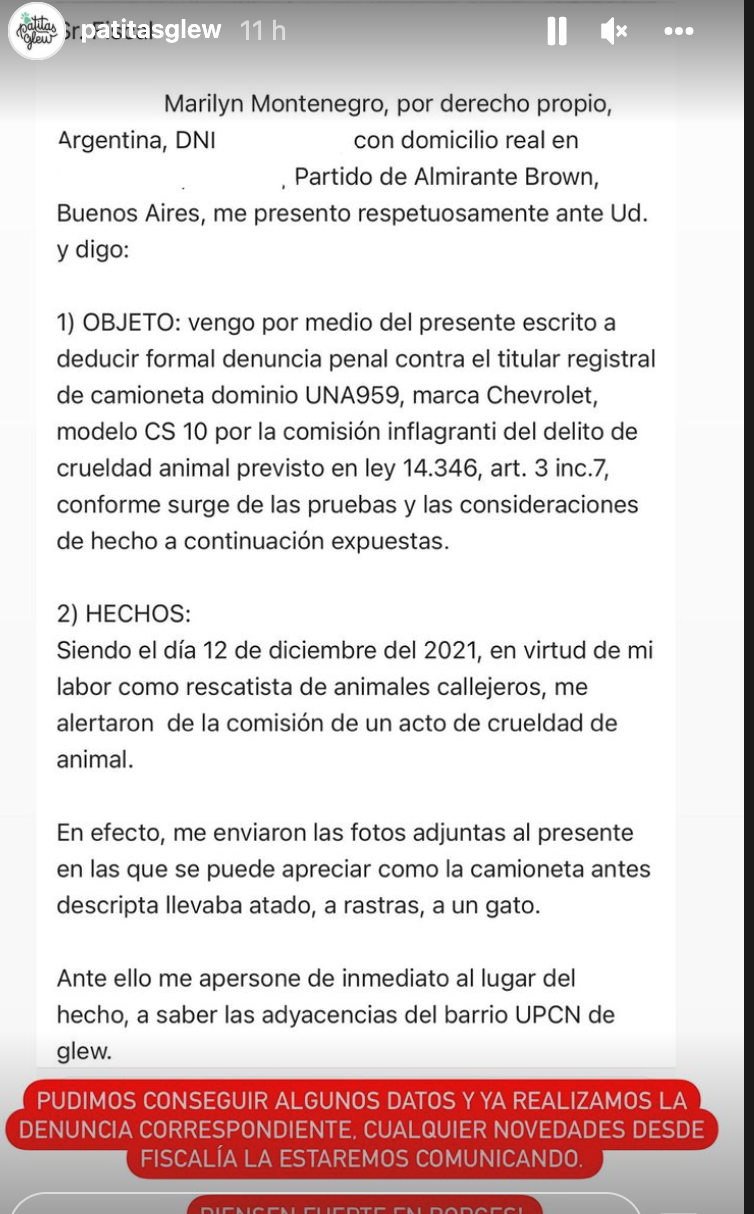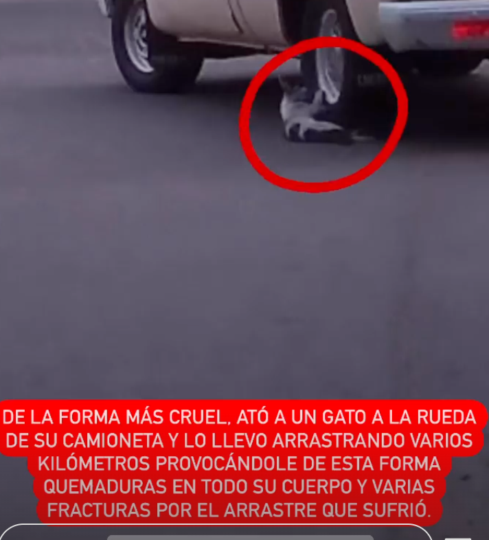 “De la forma más cruel, ató a un gato a la rueda de su camioneta y lo llevo arrastrando varios kilómetros provocándole de esta forma quemaduras en todo su cuerpo y varias fracturas por el arrastre que sufrió.