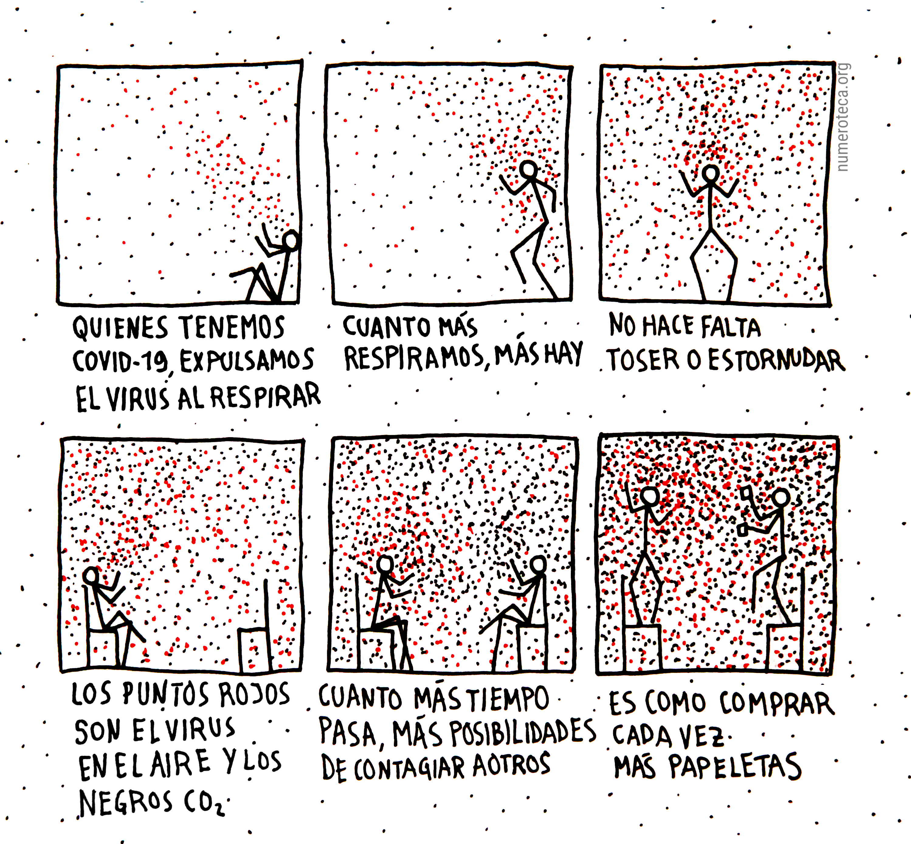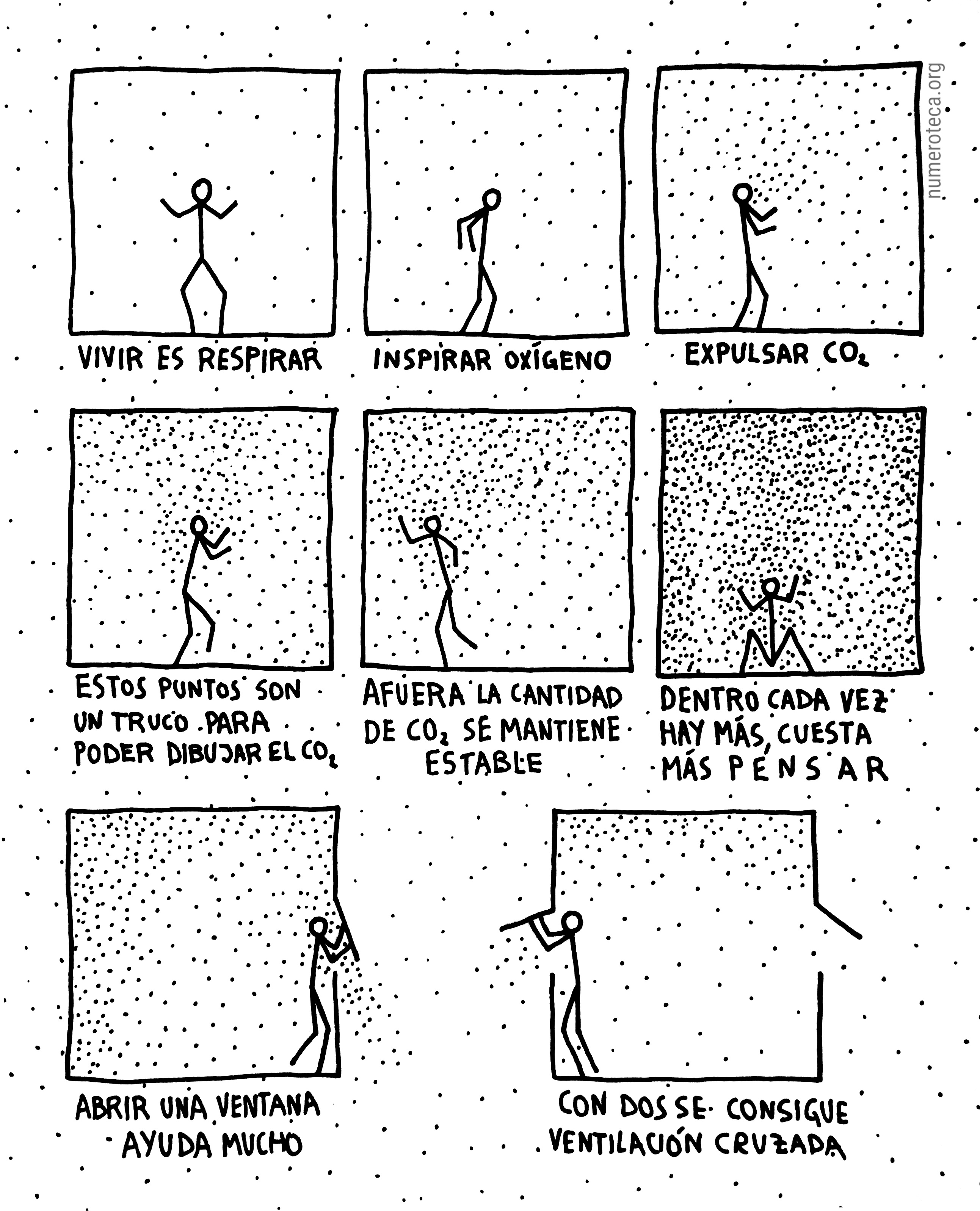El sitio web amigo numeroteca explica los riesgos de estar en lugares poco ventilados. Y de la relación posible entre el dióxido de carbono que exhalamos al respirar y la carga viral. La necesidad urgente de respetar los protocolos según la normativa vigente.