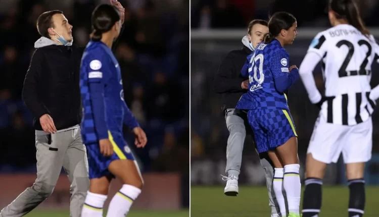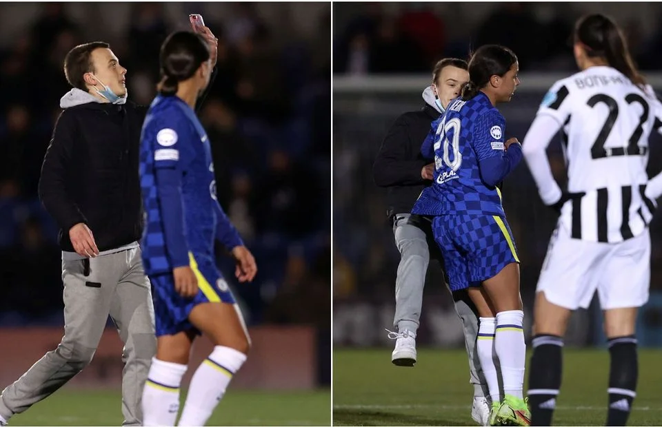 La delantera del Chelsea, Sam Kerr, decidió actuar por su cuenta. Golpeó con el hombro al intruso, haciéndole caer al suelo. El público encontró el incidente muy divertido y no se mostró muy impresionado cuando Kerr recibió una tarjeta amarilla por sus acciones.