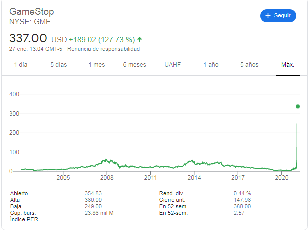 Hace dos semanas, una acción de GameStop valía 17 dólares. En este momento vale 337 dólares. Acá tienen el gráfico histórico de GameStop de los últimos 20 años para que entiendan el impacto de lo que estos pibes lograron.