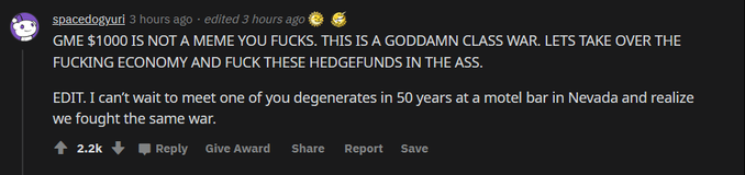 Si uno entra al subforo de Reddit (r/wallstreetbets) va a ver que los usuarios ven esto como una guerra contra una clase que odian y que esta es su revancha. A la larga, la acción de GameStop va a volver a bajar, pero en el medio muchos usuarios se están haciendo ricos y llevándose a actores de peso en el camino. Salud por ellos.