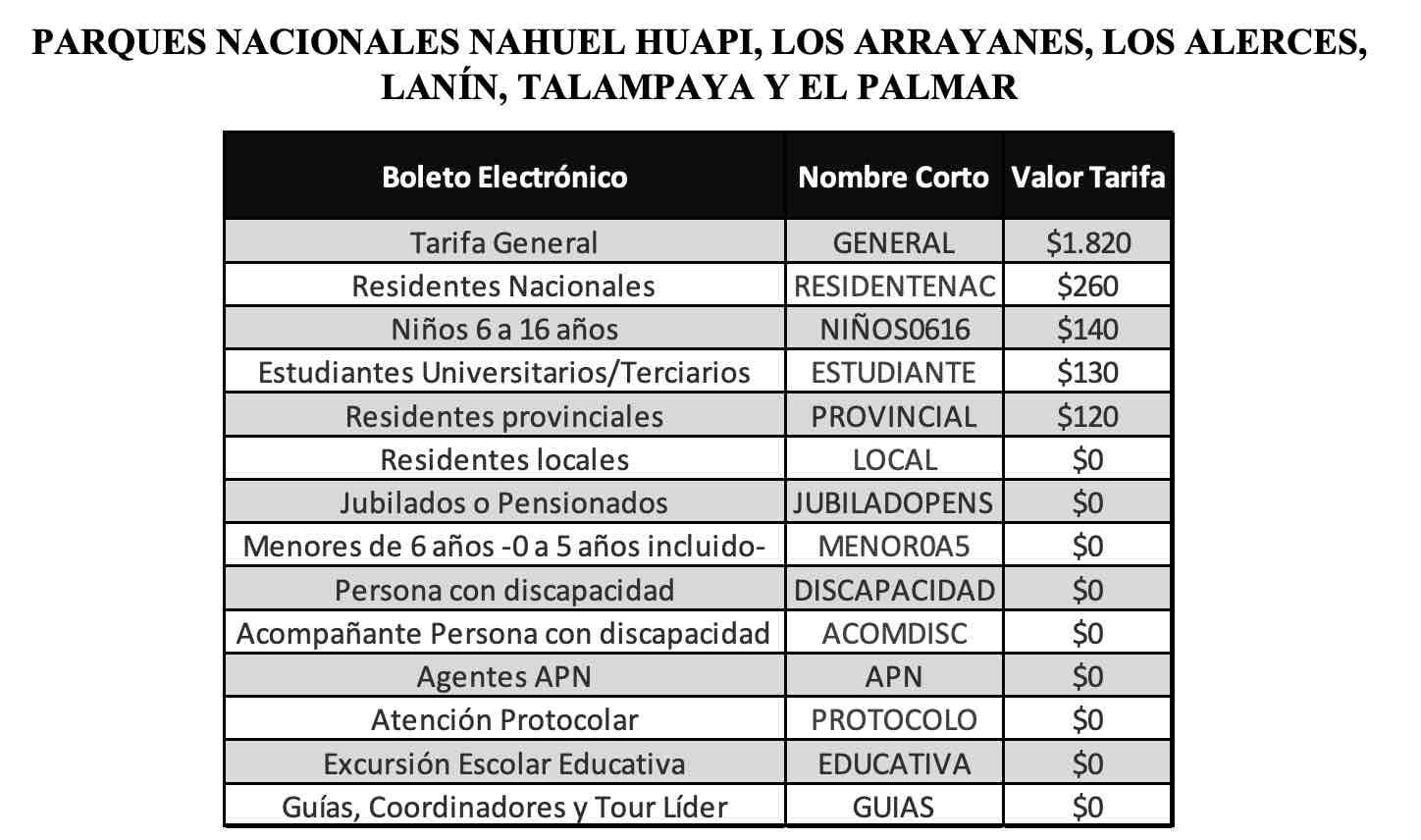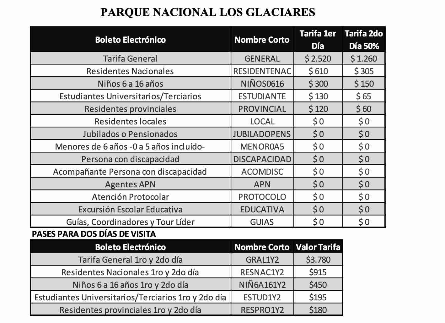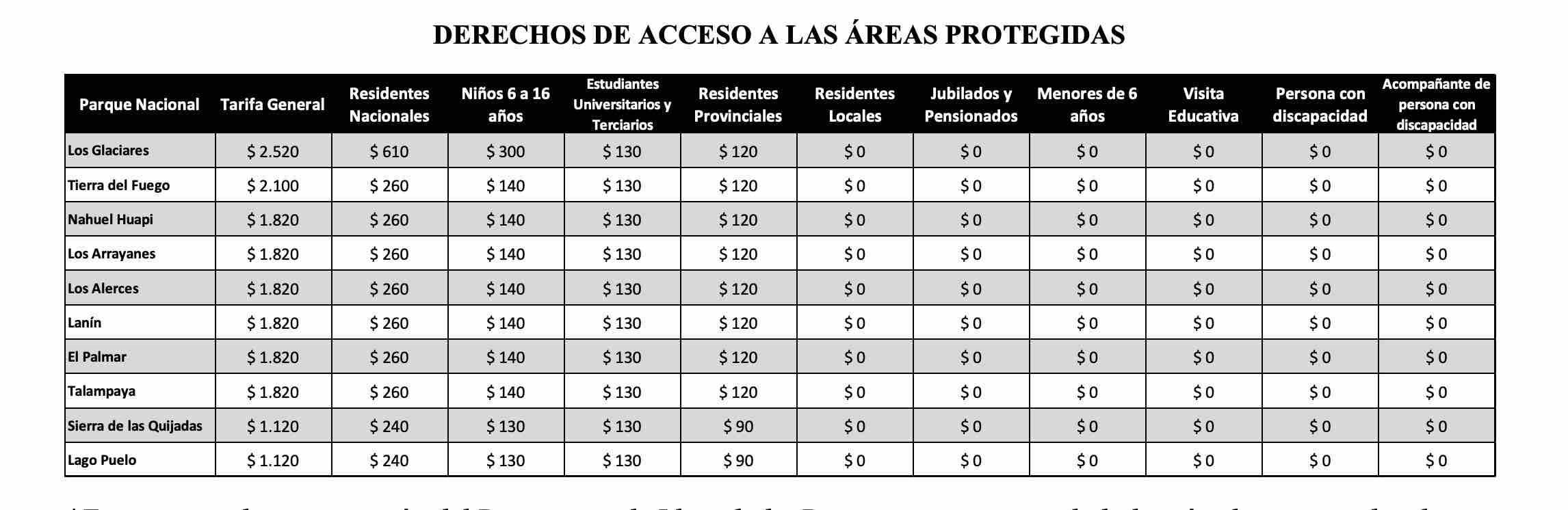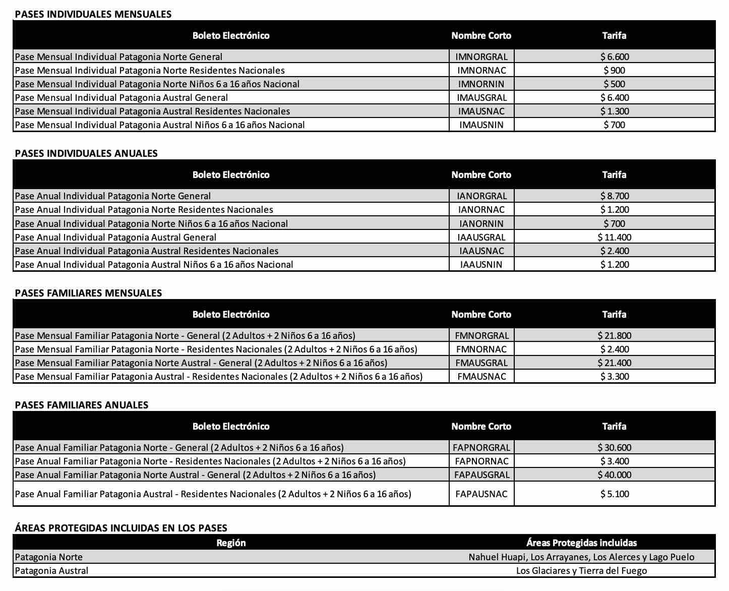 Se actualizan tarifas y pases para ingresar al Parques Nacionales Iguazú, Los Glaciares, Tierra del Fuego, Nahuel Huapi, Los Arrayanes, El Palmar, Talampaya, Los Alerces, Lago Puelo y los pases promocionales,