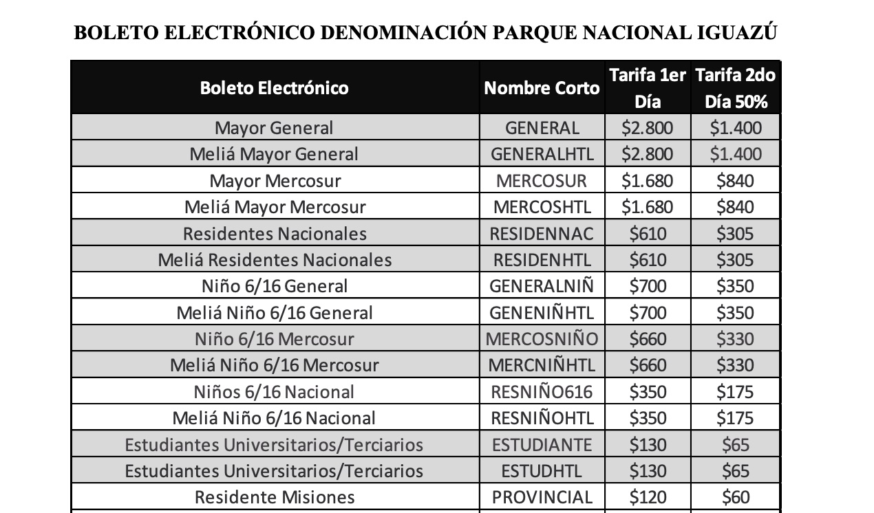 Se fijaron los pases para el acceso a los parques nacionales de Argentina. Hay descuentos para residentes Mercosur, como Brasil, Paraguay, Boliviay Uruguay, y residentes locales. También un pase anual
