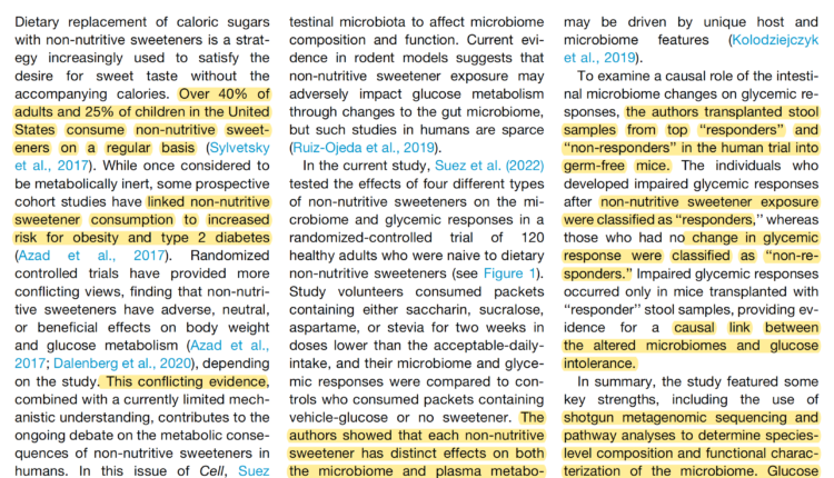 En particular, la capacidad de la mayoría de estos estudios para detectar y excluir a las personas que ya incorporaban edulcorantes en sus dietas fue limitada, y su microbioma se perfiló mediante la secuenciación del gen 16S rRNA o qPCR de los microbios objetivo, que pueden carecer de la resolución suficiente para determinar funciones y especies. efectos de nivel de NNS en el microbioma.