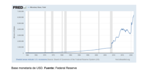 Por ejemplo, Estados Unidos decidió enviar USD 1.200 a millones de personas para combatir el impacto económico de la pandemia. Como resultado, se duplicó la base monetaria de Estados Unidos en dos años, entre 2019 y 2021. lo que naturalmente trae como consecuencia aumento en el nivel general de precios, mejor conocido como inflación.