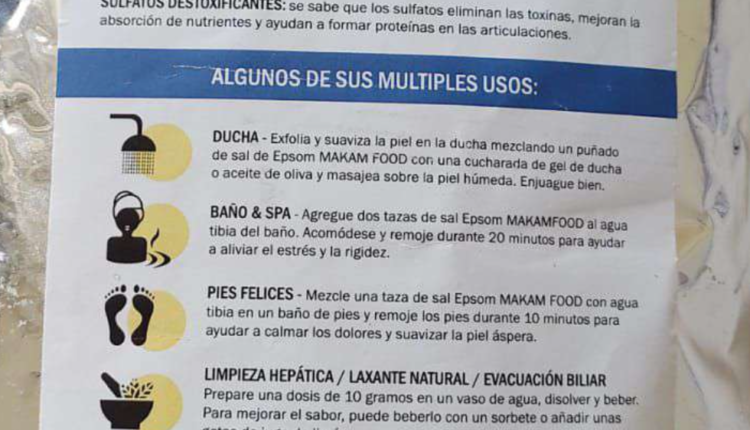 Se vende como Fibra soluble natural y panificados sin gluten, Cont. Neto 100 grs, Vencimiento: 19 MAY 2024, Envasado por Makam Food, Origen Argentina” y “Sal de Epsom, Sulfato de magnesio, 100% puro, Cont. Neto 500 grs, Vencimiento: 18 ABR 2024, Envasado por Sociedad Comercial Australis Ltda., Santiago de Chile, Chile N° 1606294025”, que no cumplirían con la normativa alimentaria vigente.