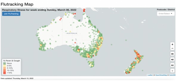 FluTracking es un proyecto que consiste en una encuesta semanal voluntaria sobre enfermedades respiratorias, como COVID-19 y gripe, con la que se genera un mapa y estadísticas de dichas enfermedades actualizadas semanalmente.