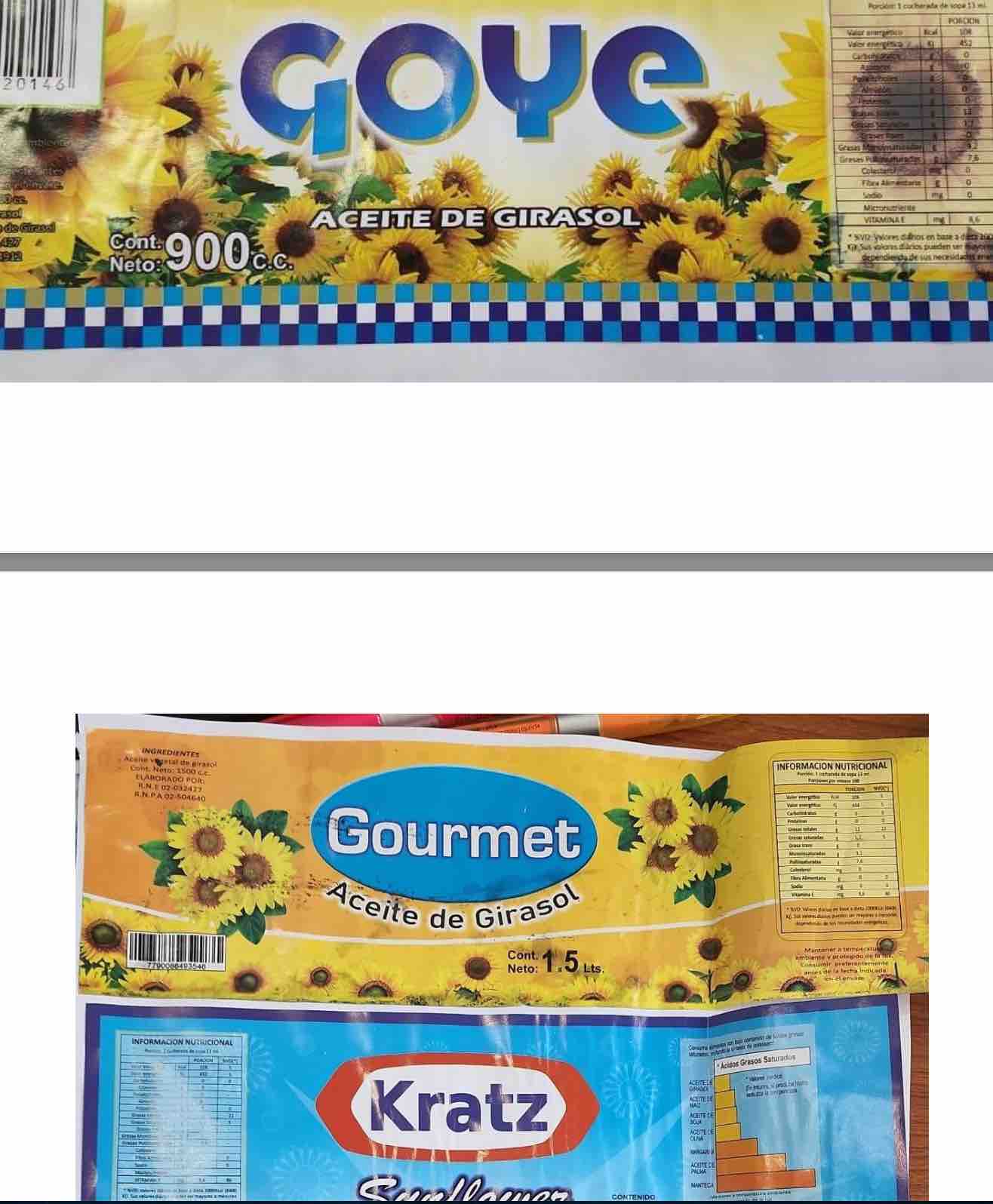 ARTÍCULO 1°.- Prohíbese la elaboración, fraccionamiento y comercialización en todo el territorio nacional de los productos: “Aceite de girasol, marca Gourmet, RNE 02-032427, RNPA 02-504640”, por carecer de registros de establecimiento y de producto, y por estar falsamente rotulado al exhibir en sus rótulos números de RNE vencido y de RNPA inexistente; “Aceite de girasol, marca “El Favorito”, RNE N° 020007188, RNPA 02-146234”, por carecer de registros de establecimiento y de producto, y por estar falsamente rotulado al exhibir en sus rótulos números de RNE y de RNPA inexistentes; “Aceite de girasol, marca “Don José”, RNE N°02032427, RNPA N°02-504972”, por carecer de registros de establecimiento y de producto, y por estar falsamente rotulado al exhibir en sus rótulos un RNE vencido y un RNPA pertenecientes a otra razón social y producto; “Aceite Girasol mezcla marca “Holistic”, RNE EX –2021-27623769, RNPA EX– 2019 – 30205805”, por carecer de registros de producto, y por estar falsamente rotulado al exhibir en sus rótulos RNPA en trámite que corresponde a otra razón social y otro establecimiento dado de baja; “Aceite de girasol marca “Holistic”, RNE N°02-034.145, RNPA EX-2019-21988412”, por carecer de registros de establecimiento y de producto, y por estar falsamente rotulado al exhibir en sus rótulos un RNE el cual se encuentra dado de baja y un RNPA perteneciente a otra razón social y otro establecimiento dado de baja; “Girasol Blend, marca “King”, RNE N°02-032427, RNPA N° 2020-2096-504961”, por carecer de registros de establecimiento y de producto, y por estar falsamente rotulado al exhibir en sus rótulos un RNE vencido y un RNPA inexistente; “Aceite de girasol, marca “Kratz”, RNE N°02-034145, RNPA N°2020-0340058”, por carecer de registros de establecimiento y de producto, y por estar falsamente rotulado al exhibir en sus rótulos un RNE dado de baja y un RNPA inexistente; y “Aceite de girasol, marca “Goye”, RNE N° 02-032427, RNPA N°02-504912” por carecer de registros de establecimiento y de producto, por estar falsamente rotulado al exhibir en sus rótulos números de RNE vencido y RNPA no vigente y correspondiente a otro producto.