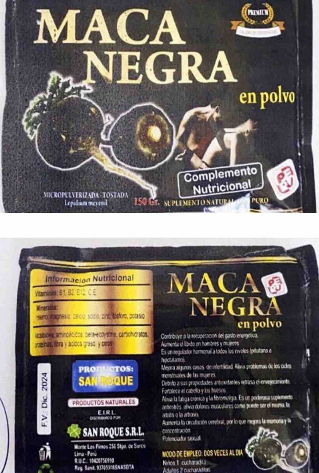 ARTÍCULO 1°.- Prohíbese la elaboración, fraccionamiento y comercialización en todo el territorio nacional y en los sitios de venta en línea, en cualquier presentación, lote y fecha de vencimiento del producto: “Maca negra en polvo, micropulverizada, tostada, Lepidium meyenil, productos San Roque, Suplemento natural 100% puro, Razón social San Roque SRL, F, Domicilio Monte Los Pimos 256, Sgto. de Surco, Lima, Perú, RUC 10420756998, Reg. Sanit. 93705908SNASBTA”, por carecer de registros sanitarios de establecimiento y producto; por estar falsamente rotulado al indicar en su rótulo ser un “Suplemento natural 100% puro”, por no consignar en el rótulo la información obligatoria y por inducir a engaño e indicar propiedades terapéuticas, resultando ser en consecuencia un producto ilegal.