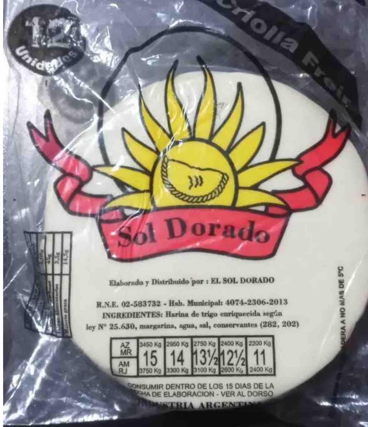 ARTÍCULO 1°. – Prohíbese la elaboración, fraccionamiento y comercialización en todo el territorio nacional, y en las plataformas de venta en línea del producto: “Tapas para empanadas, criolla freír, marca Sol Dorado, Elaborado y distribuido por EL SOL DORADO, RNE 02-583732, Hab. Municipal: 4074-2306-2013”, en cualquier presentación, lote y fecha de vencimiento, por carecer de registros sanitarios, por estar falsamente rotulado al exhibir en sus rótulos números de registros inexistentes, resultando ser en consecuencia un producto ilegal.