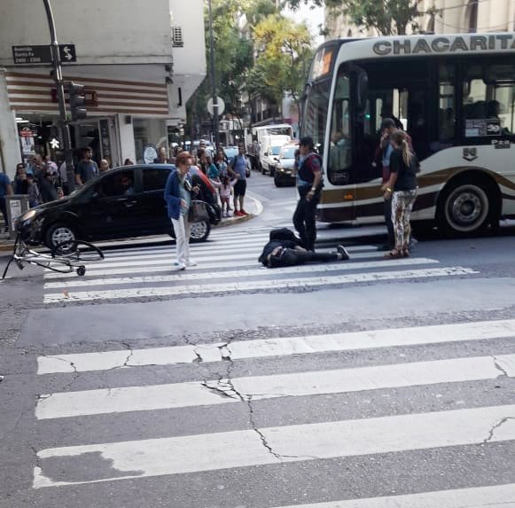 Ciclista atropellado por colectivo en Av. Santa Fe y Azcuénaga. Si colectivo lo embistió como parece surgir de la foto se presume su responsabilidad. La avenida es un lugar legal para circular.