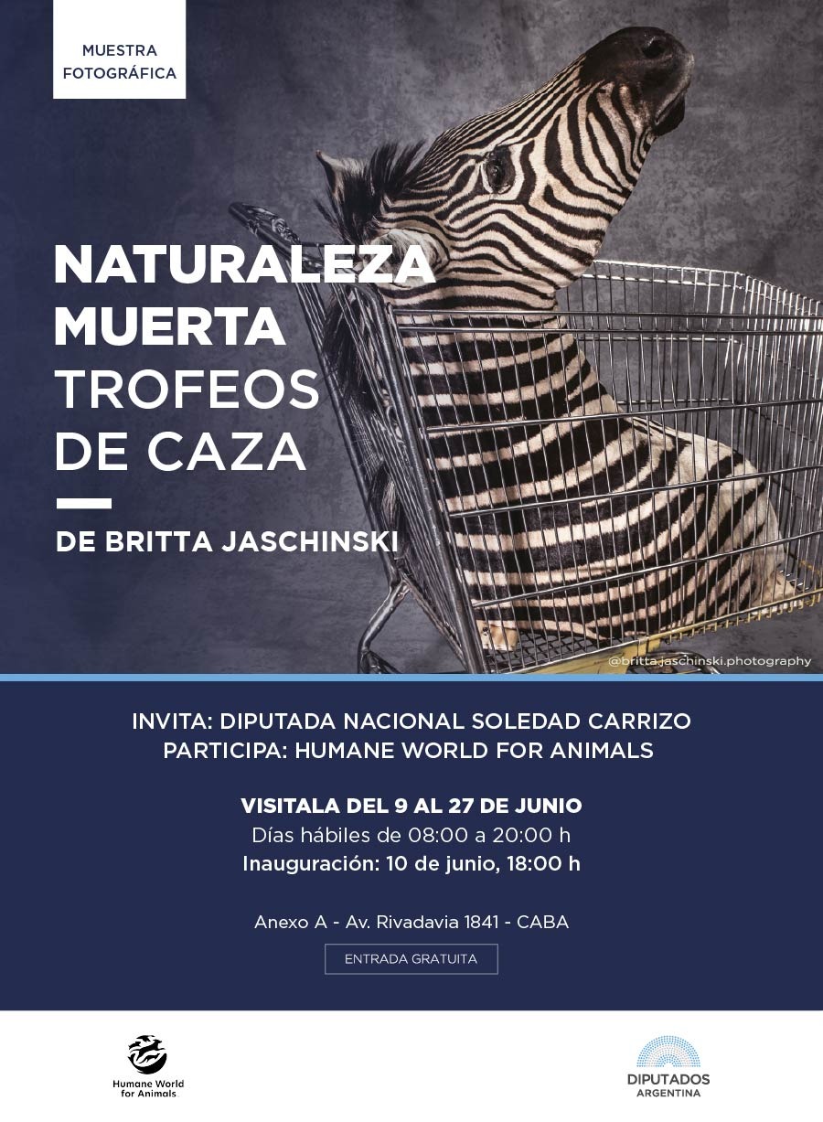 Del 9 al 27 de junio, se presenta en el Anexo “A” de la Cámara de Diputados de la Nación, la exposición “Naturaleza Muerta. Trofeos de Caza”, una muestra de fuerte impacto visual y ético que reúne 33 fotografías de trofeos de caza registradas por la premiada fotoperiodista internacional de vida silvestre, Britta Jaschinski. La inauguración se llevará a cabo el martes 10 de junio a las 18:00 en los espacios artísticos de planta baja y entrepiso del edificio