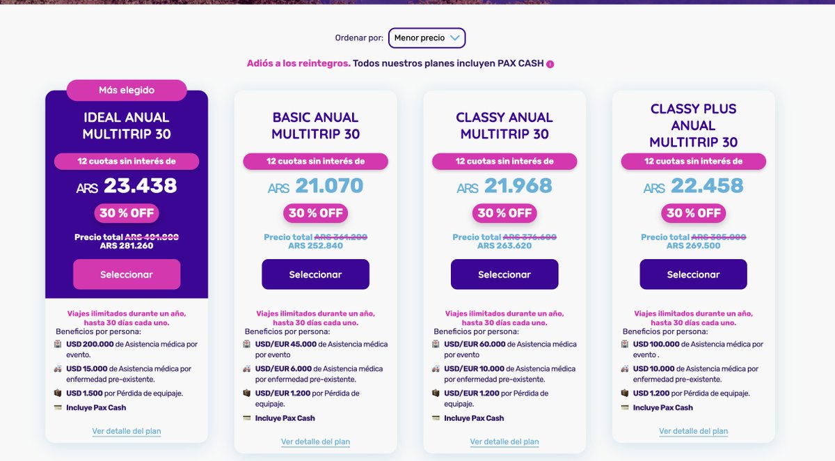 Para más de un viaje al año suele convenir este plan de Pax Assistance (ver los detalles y condiciones legales redactadas con lenguaje claro). Con el cupón DEZ5 hay un descuento plus. Viajá en Pax. El descuento se aplica con el cupón DEZ 5 en este link de Pax. (entrar por el link porque si no puede no tomar el descuento)