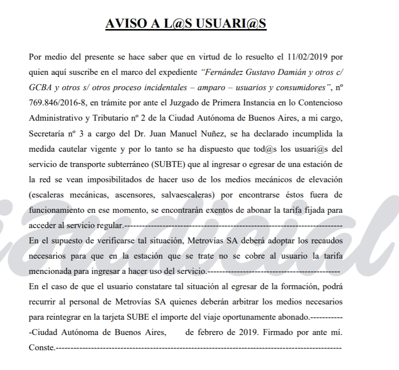 Por ende, todo usuario del subterráneo que al ingresar o egresar de una estación observe que alguna de las instalaciones mecánicas se encuentre en ese momento fuera de funcionamiento, se encontrará exento de abonar la tarifa del servicio regular, dice la medida judicial.