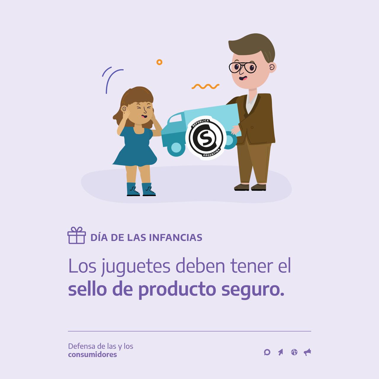 ● Los juguetes deben tener el sello de producto seguro. El sello de Seguridad Argentina garantiza que el producto aprobó los análisis toxicológicos de los materiales con los que fue producido y asegura que no presenta riesgos para los niños y niñas.